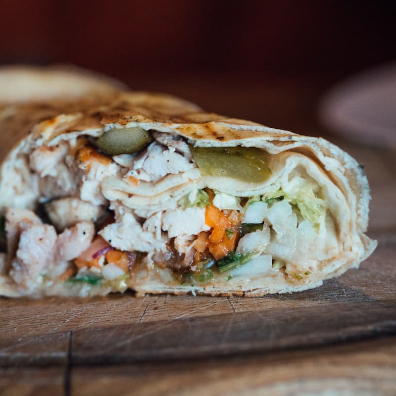 Two massive homemade flour tortillas filled with a blend of premium cheeses, a protein of your choice